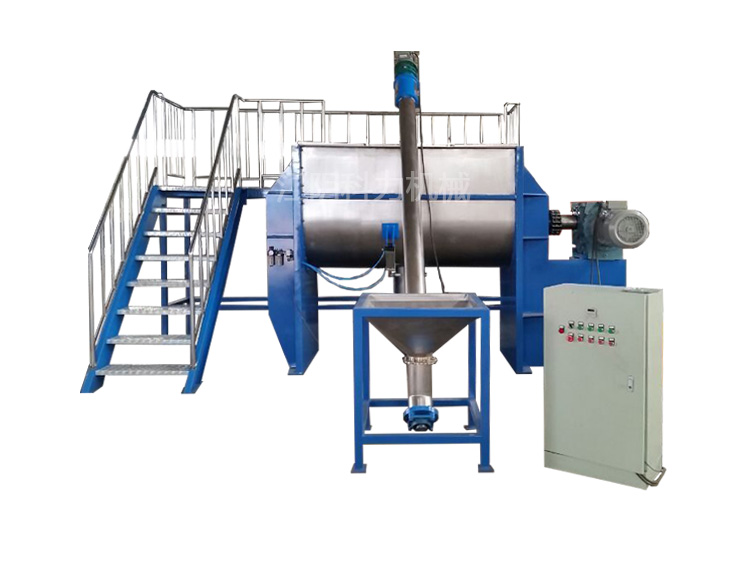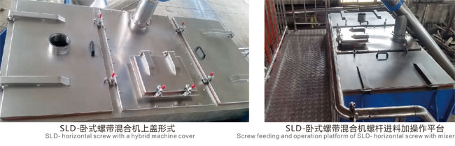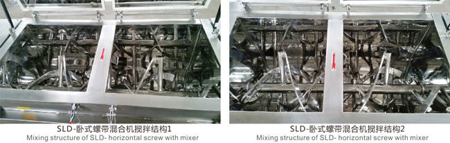 SLD series horizontal screw belt mixer is composed of U-shaped cylinder, screw belt mixing blade and transmission parts; the screw belt blade is generally made of double layers. During operation, the outer screw belt collects the materials from both sides to the center, and the inner screw belt transports the materials from the center to both sides, forming two circulation material flows. The mixing part can also be made into paddle type or added with flying knife to adapt to different materials. A discharge port is arranged at the bottom center of the mixer barrel, and the spiral structure of the outer spiral belt coordinates with the rotation direction of the main shaft to drive the materials inside the barrel wall to the central discharge port for discharging, so as to ensure that there is no dead angle for the materials inside the barrel. The cylinder cover can be made into arch or full open type, which can bear pressure, and the full open type is convenient for cleaning the inside of the equipment. The advantages of this machine are wide application range, high mixing uniformity, short mixing time and large loading coefficient.