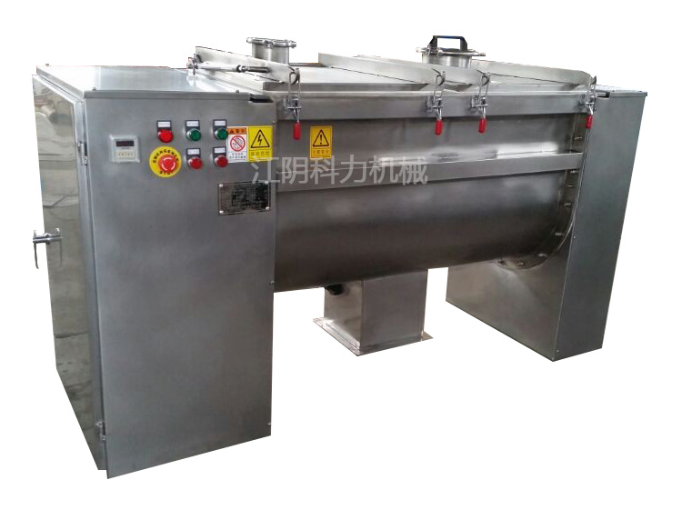 SLD series horizontal screw belt mixer is composed of U-shaped cylinder, screw belt mixing blade and transmission parts; the screw belt blade is generally made of double layers. During operation, the outer screw belt collects the materials from both sides to the center, and the inner screw belt transports the materials from the center to both sides, forming two circulation material flows. The mixing part can also be made into paddle type or added with flying knife to adapt to different materials. The bottom center of the mixer cylinder is provided with a discharge port, and the spiral structure of the outer spiral belt coordinates with the rotation direction of the main shaft to drive the materials inside the cylinder wall to the central discharge port for discharging, so as to ensure that there is no dead angle in the discharge of materials inside the cylinder. The cylinder cover can be made into arch or full open type, which can bear pressure, and the full open type is convenient for cleaning the inside of the equipment. The advantages of this machine are wide application range, high mixing uniformity, short mixing time and large loading coefficient.