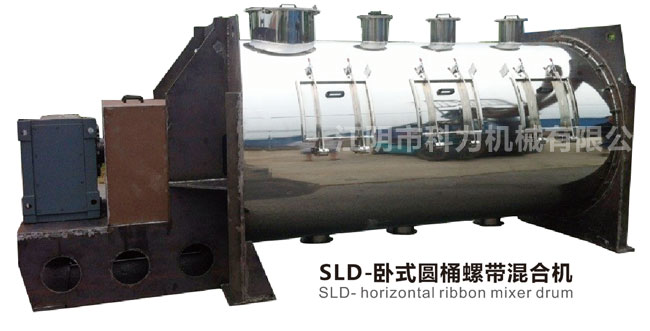 SLD系列卧式螺带混合机由U形筒体、螺带搅拌叶片和传动部件组成;螺带状叶片一般做成双层,工作时外层螺带将物料从两侧向中央汇集,内层螺带将物料从中央向两侧输送,形成了二个循环物流。搅拌部件还可以制作成桨叶式或增加飞刀,适应不同的物料。